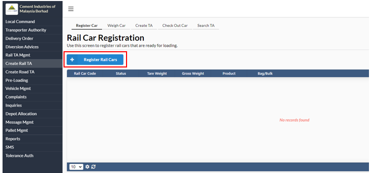 User can register rail car’s here that are ready for loading. To register, user need to click on the Register Rail Cars button. Once it's clicked, a new dialog box will appear where the user can add the rail cars to register.