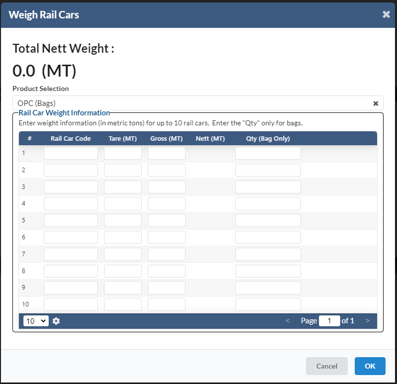 User can register tare and second weight for rail cars. To add the weight details, user need to click on the Weigh Rail Cars button. A new dialog box will appear for the user to enter weight information (in metric tons) for up to 10 rail cars.