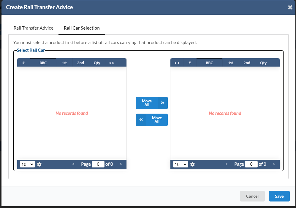 In this tab, user can create rail transfer advices. To create, user need to click on the Create Rail Transfer Advice button. A new dialog box will appear with two tabs which are Rail Transfer Advice and Rail Car Selection.