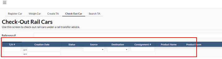 User can check-out rail cars under a rail transfer advice. User can search for records by filing in either: