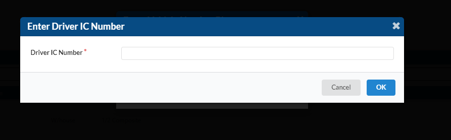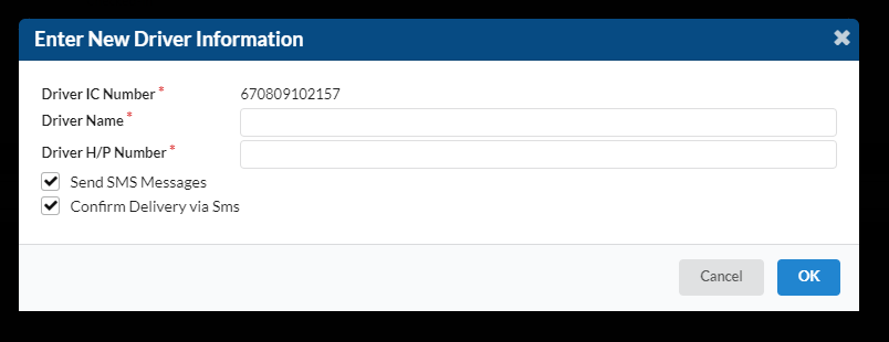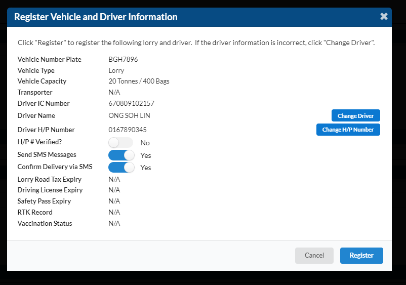 If the driver has been registered before, you will be greeted with the "Register Vehicle and Driver Information" dialogue box after you enter the driver's IC number
