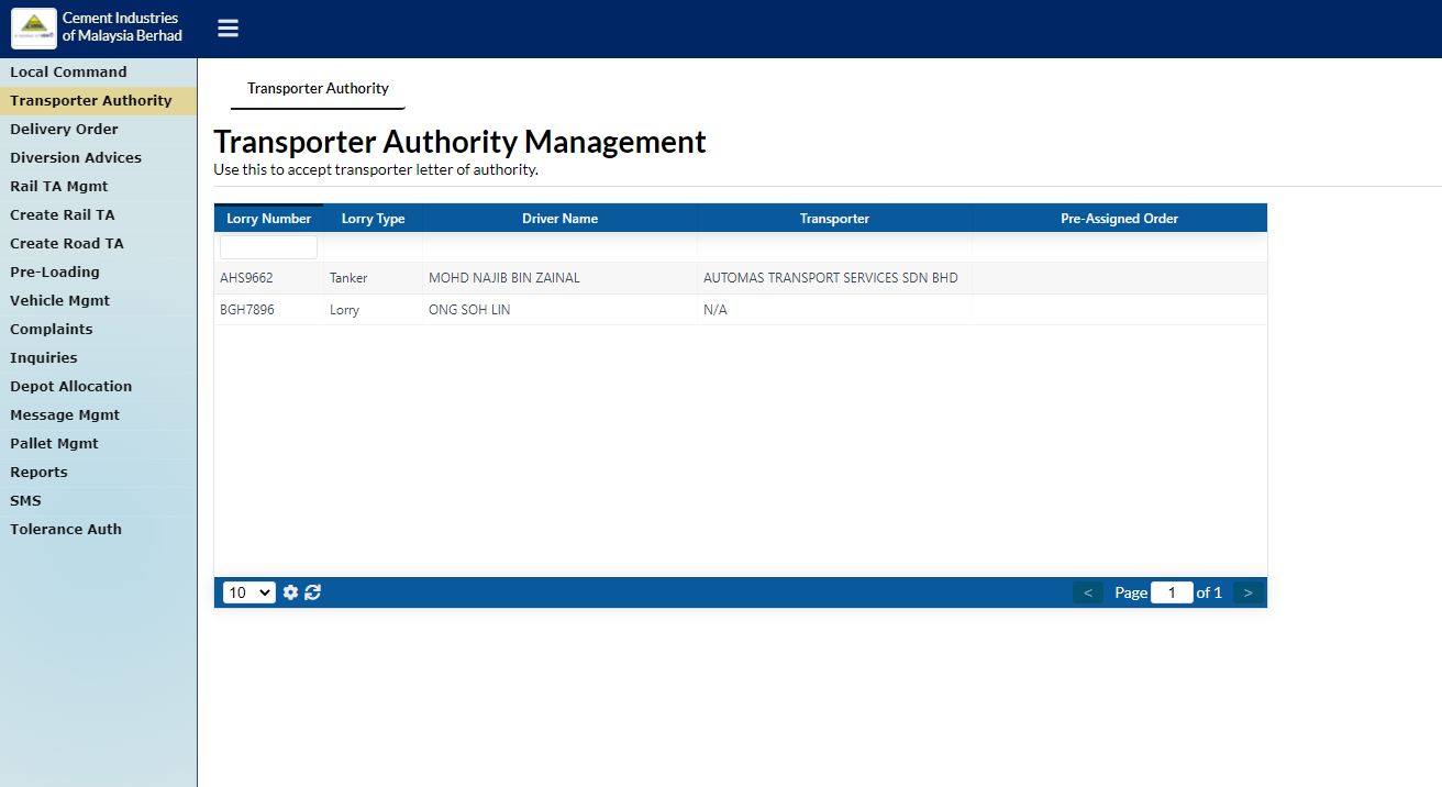 After registering lorry, navigate to "Transporter Authority" page. Click at any intended registered lorry.