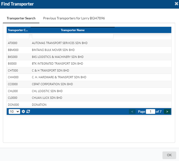 The "Find Transporter" dialog box will appear for user to search the transporter name that available on the list. Click at any intended transporter name.