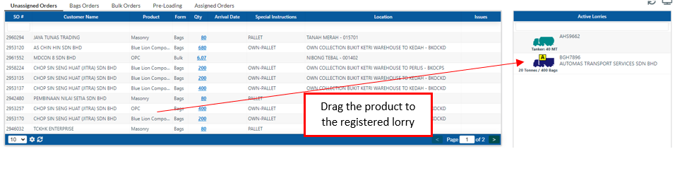 User has to drag the products to the registered lorry which is under Active Lorries area.