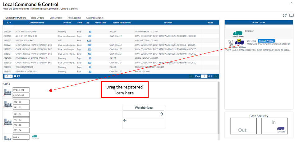 After that, drag the registered lorry to the Silos section. You can see the lorry is in the gate security.